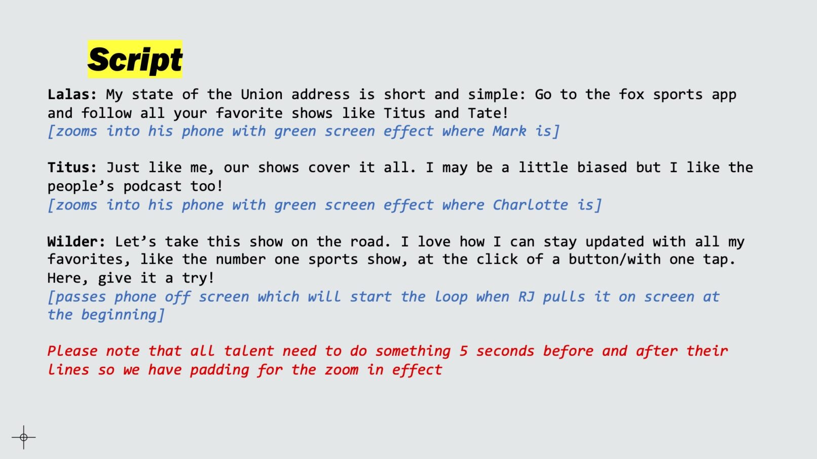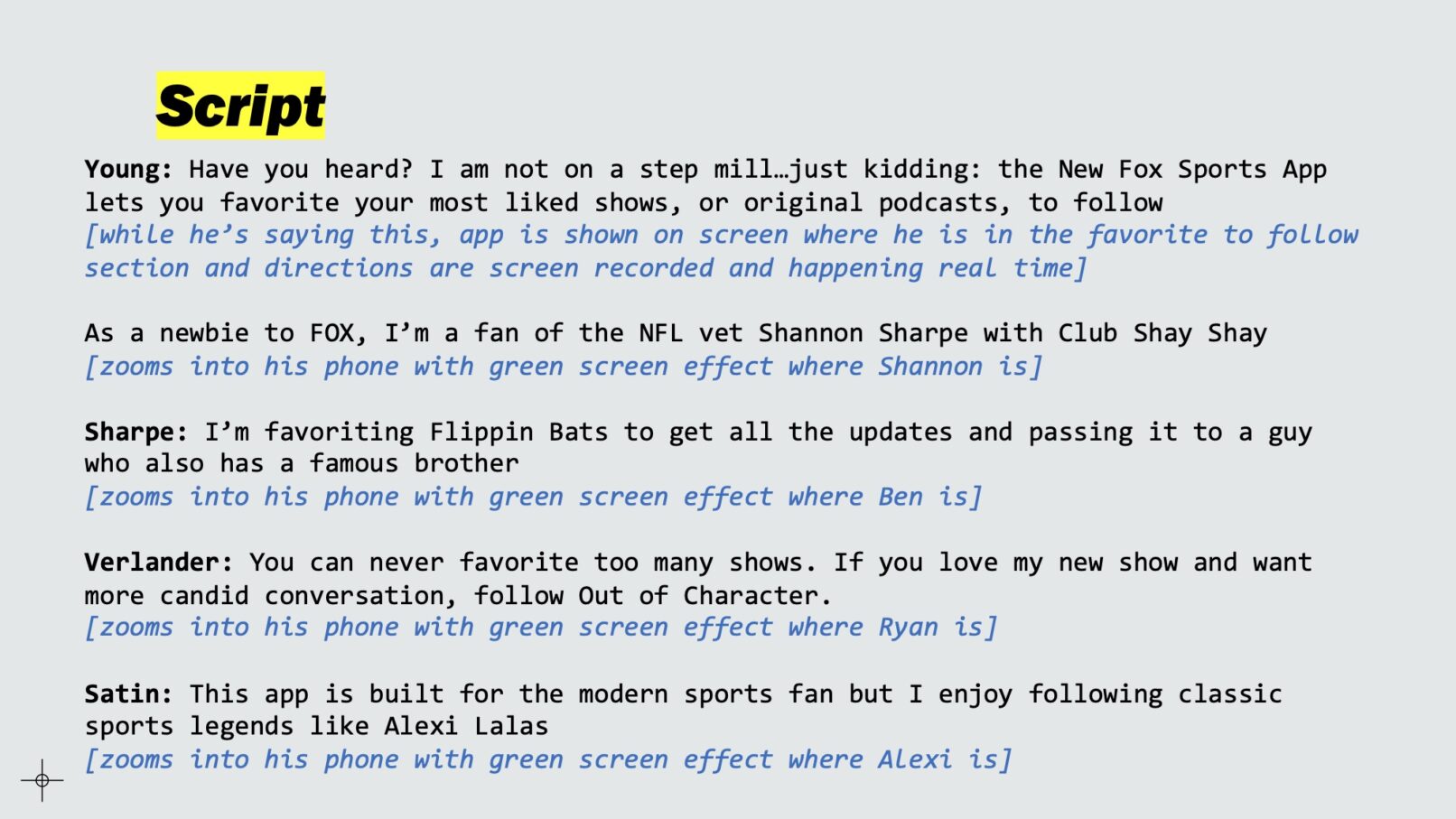 This first video was received well so I pitched another concept for a phone inception video that now incorporated our talent. I was able to work with the biggest names at our network. Most were recorded in studio but one was recorded online since they were remote. The new goal was to push users to favorite teams, players, and shows to subscribe and receive updates. The original pitch deck is included to provide the full scope of the project. Editing was done in After Effects using the Mocha AE plugin to rotoscope the green screen on the phones.